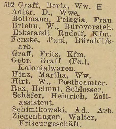 Berta Graff. Książka adresowa gminy Oliwa z 1925 roku. Zbiory Pomorskiej Biblioteki Cyfrowej.