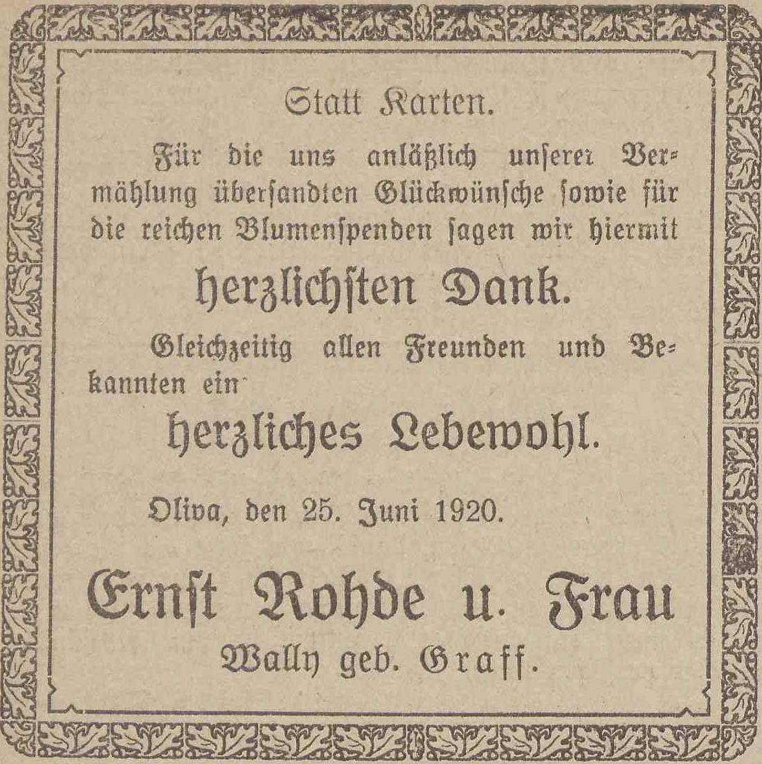 Ślub. Ernst Rohde z Wally Rohde zd. Graff. Olivaer Zeintung nr 146 z 25. 06. 1920 r.
