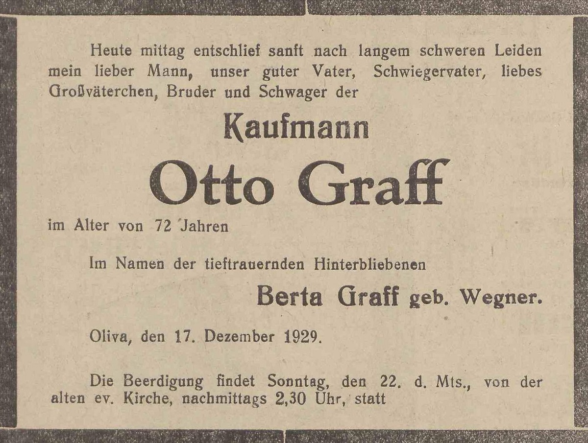 Otto Graff. Berta Graff zd. Wegner. Olivaer Zeintung nr 296 z 18. 12. 1929 r.