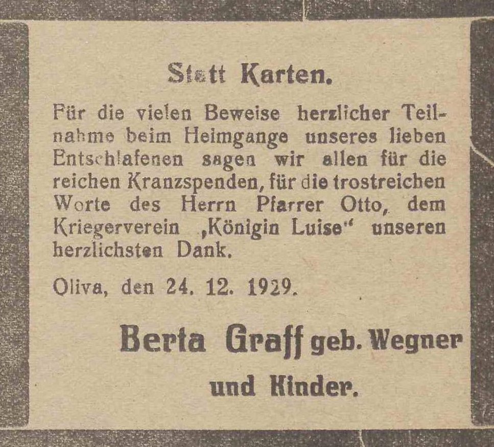 Berta Graff zd. Wegner. Olivaer Zeintung nr 301 z 24. 12. 1929 r.