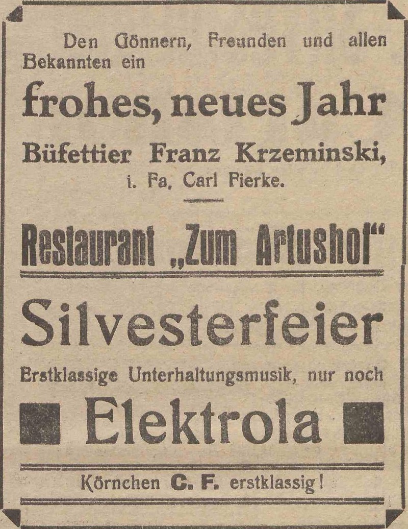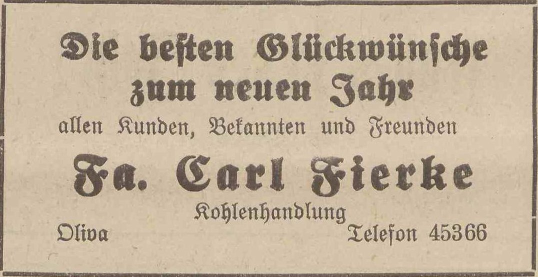 Fa. Carl Fierke, Kohlenhandlung. Podziękowania noworoczne, Danzig-Olivaer Zeitung nr 305 z 31. 12. 1931.