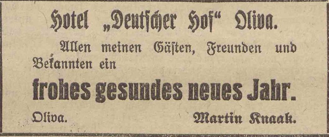 Martin Knaak, "Deutscher Hof". Podziękowania noworoczne, Olivaer Zeitung nr 305 z 31. 12. 1924.