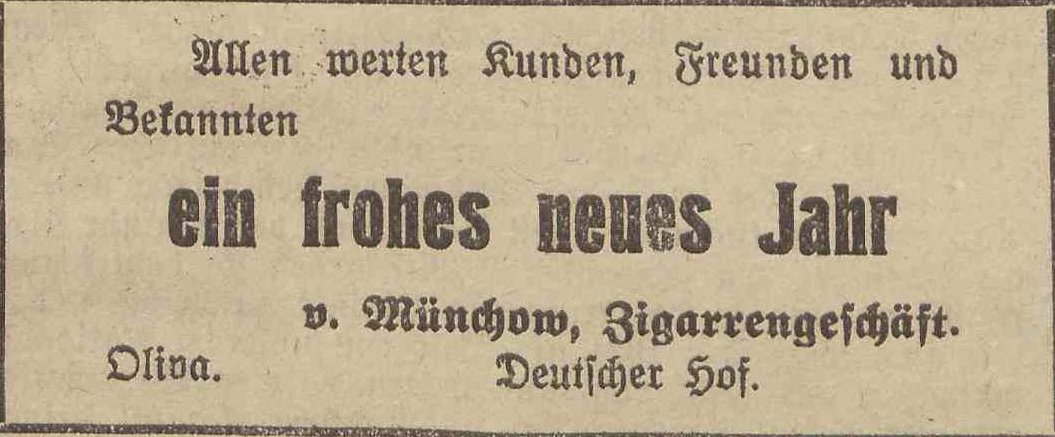 Bruno Münchow, "Deutscher Hof". Podziękowania noworoczne, Olivaer Zeitung nr 305 z 31. 12. 1924.