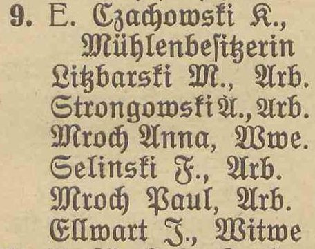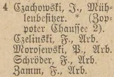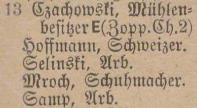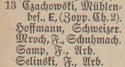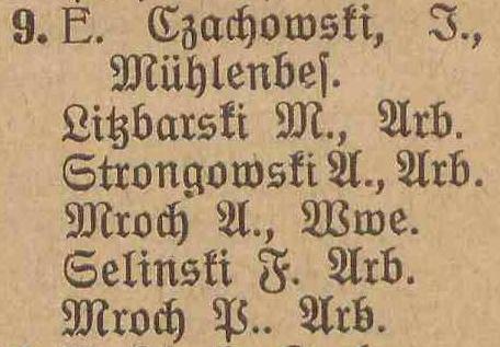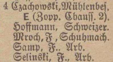 Danziger Chaussee 4: Joseph Schimmich, ... Jaschewski, Joseph Jaskulski, Franz Schelinski. Spis z 1895 roku. Przekazała Grażyna Niemyjska.