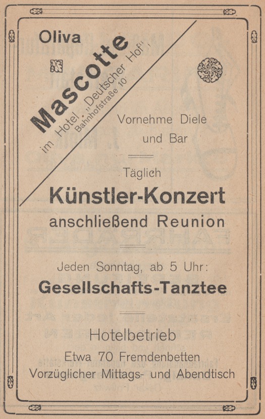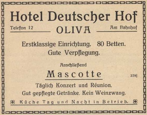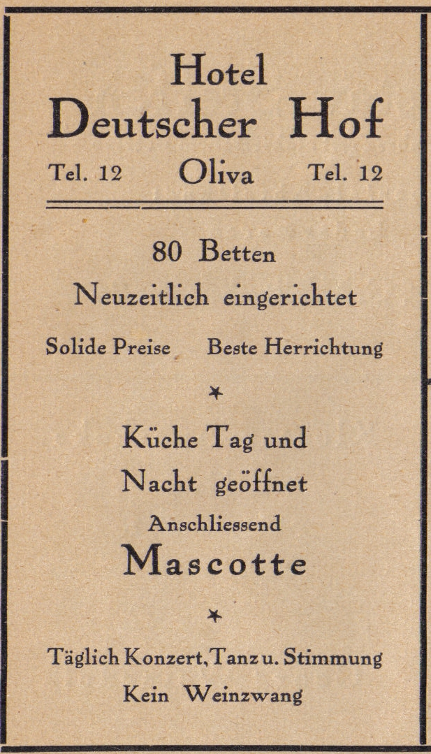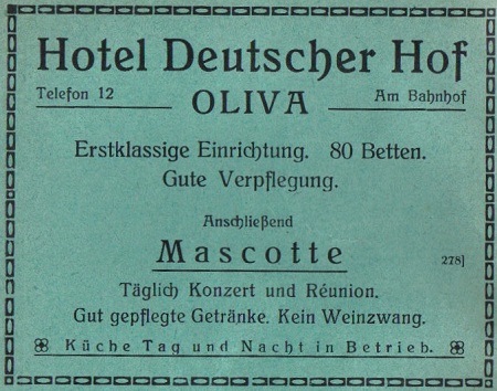 Hotel Deutscher Hof - otwarcie 30 września 1915. Olivaer Nachrichten z 1915 roku. Przekazała Grażyna Niemyjska.