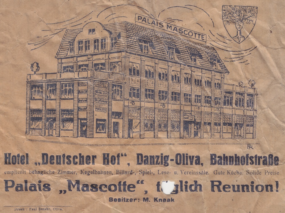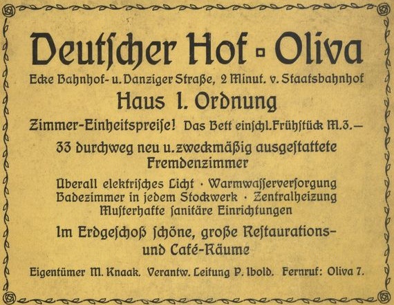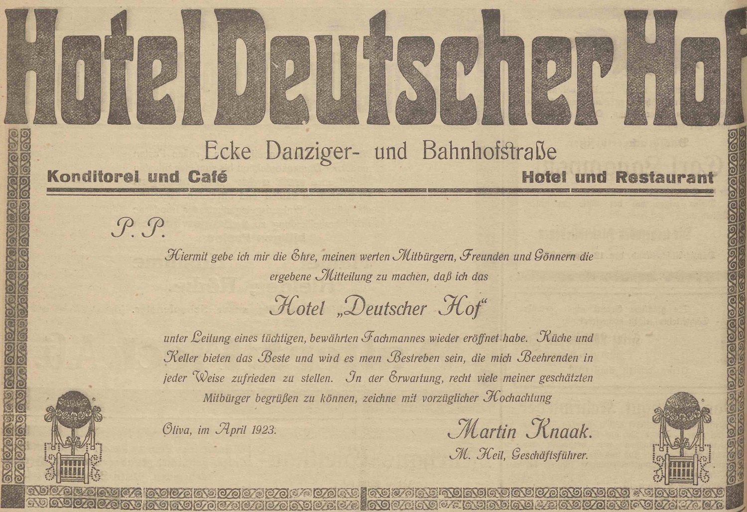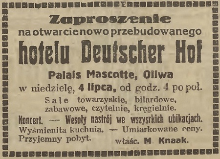 Martin Knaak. Ponowne otwarcie hotelu Deutser Hof. M. Heil, dyrektor zarządzający. Olivaer Zeintung nr 87 z 14. 04. 1923 r.