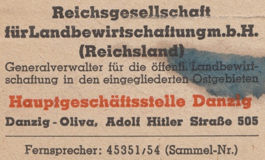 Reichsgesellschaft für Landbewirtschaftung m.b.H. (Spółka Rzeszy ds. Gospodarki Rolnej). Około 1943-1944 r. Zbiory Mirosława Piskorskiego.