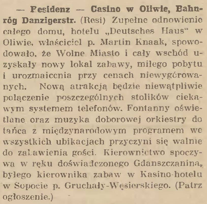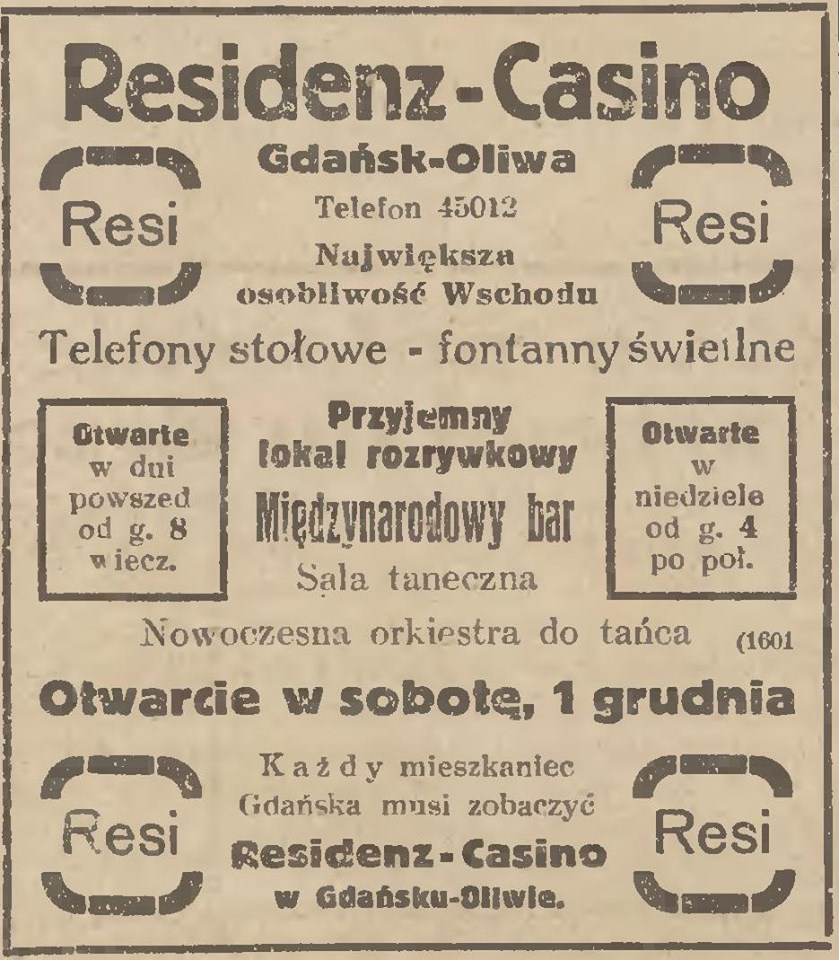 Residenz-Casino. Resi. Gazeta Gdańska z 30. 11. 1926 roku. Zbiory Pomorskiej Biblioteki Cyfrowej.