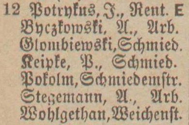| 1913 | - | Pokolm, Schmiedmeister, właściciel, Danziger Chaussee 54 |
