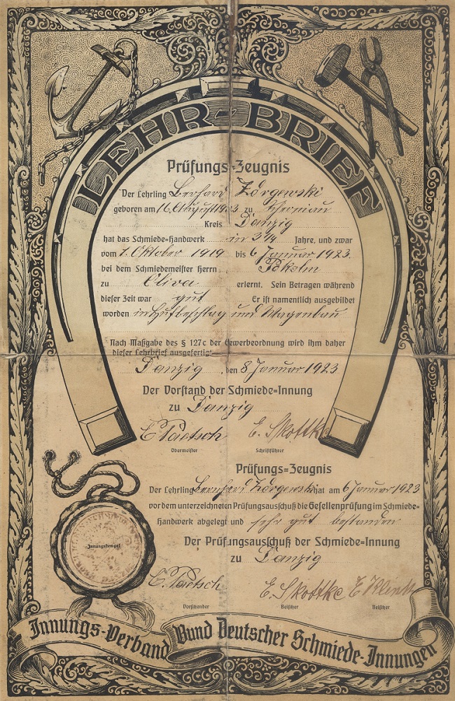 Świadectwo czeladnicze informujące o ukończeniu praktyki kowalskiej trwającej 3 i 1/4 roku w zakładzie mistrza Pokolm w Oliwie wydane w 1923 roku. Przekazał syn (2011 r.) osoby prakykującej w zakładzie.