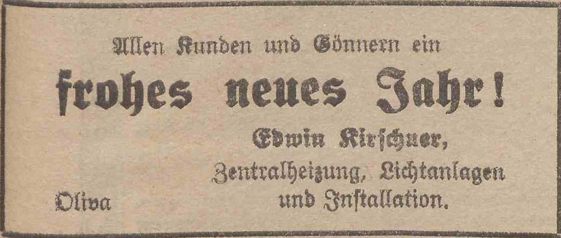 Edwein Kirschuer. Podziękowania noworoczne, Olivaer Zeitung nr 306 z 31. 12. 1928.