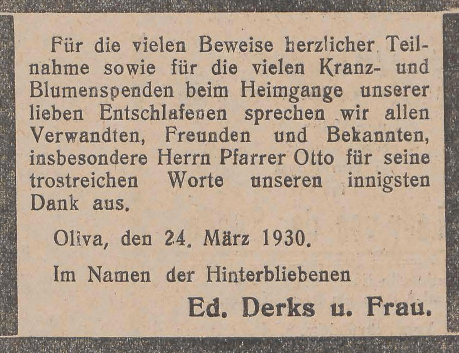 Eduard Derks. Olivaer Zeintung nr 72 z 26. 03. 1930 r.
