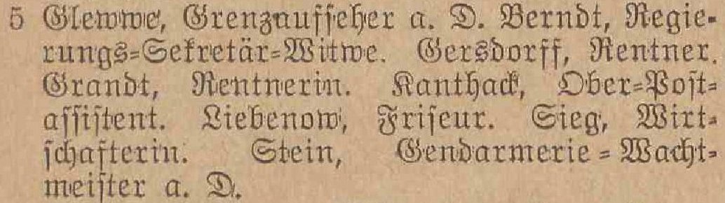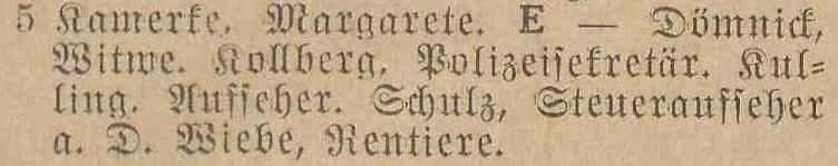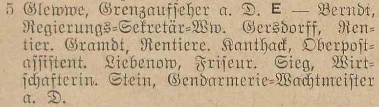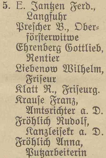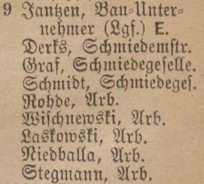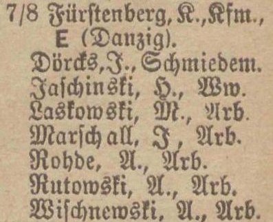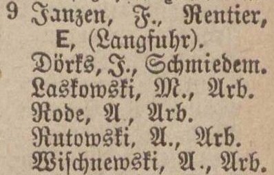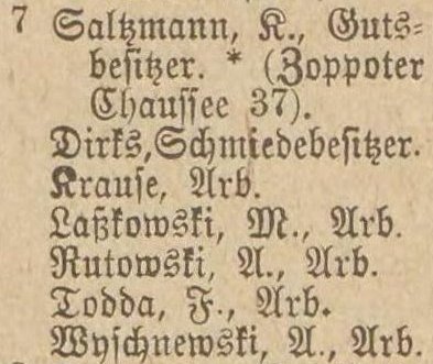 Danziger Chaussee 7: Michael Laskowski, ... Bigus, Franz ..., Franz Tadda, Josef Skomroch. Spis z 1895 roku. Przekazała Grażyna Niemyjska.