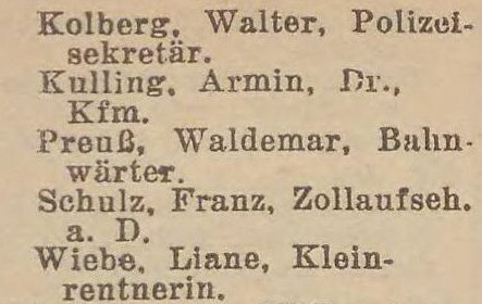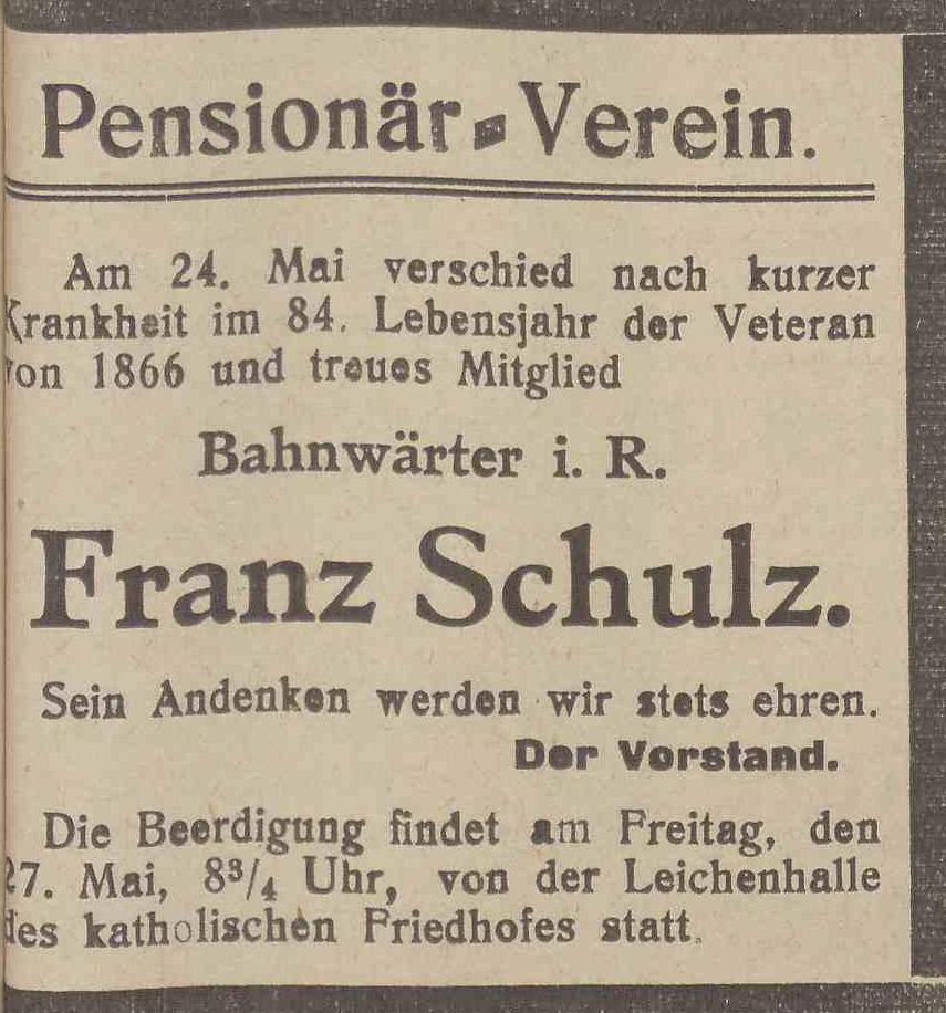 Schulz, Franz, nadzorca celny w stanie spoczynku (Zollaufseher a. D.).