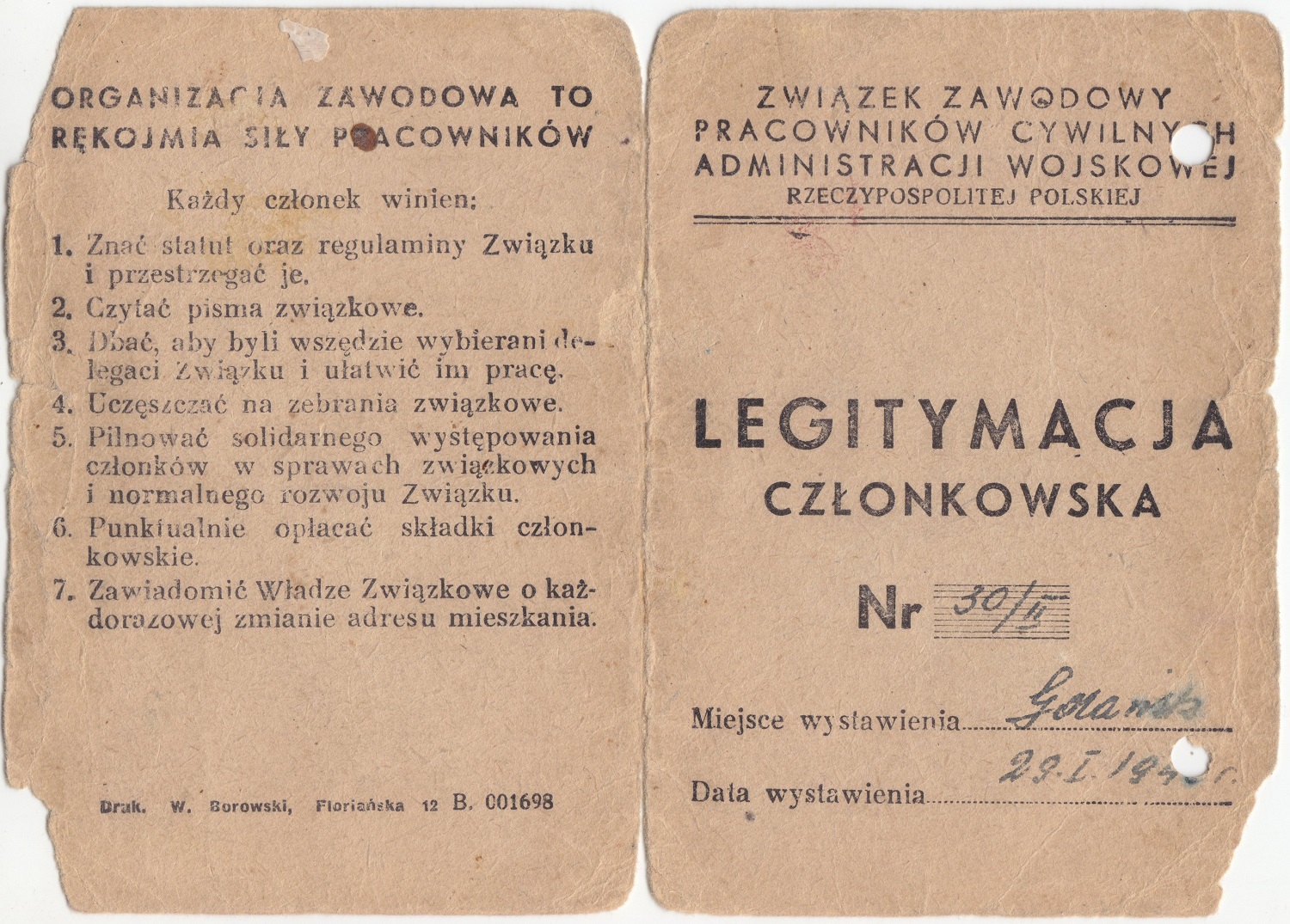 Helena Więchowska. Związek Zawodowy Prac. Cyw. Administracji Wojsko-wej. 1946 rok. Zbiory Piotra Leżyńskiego.
