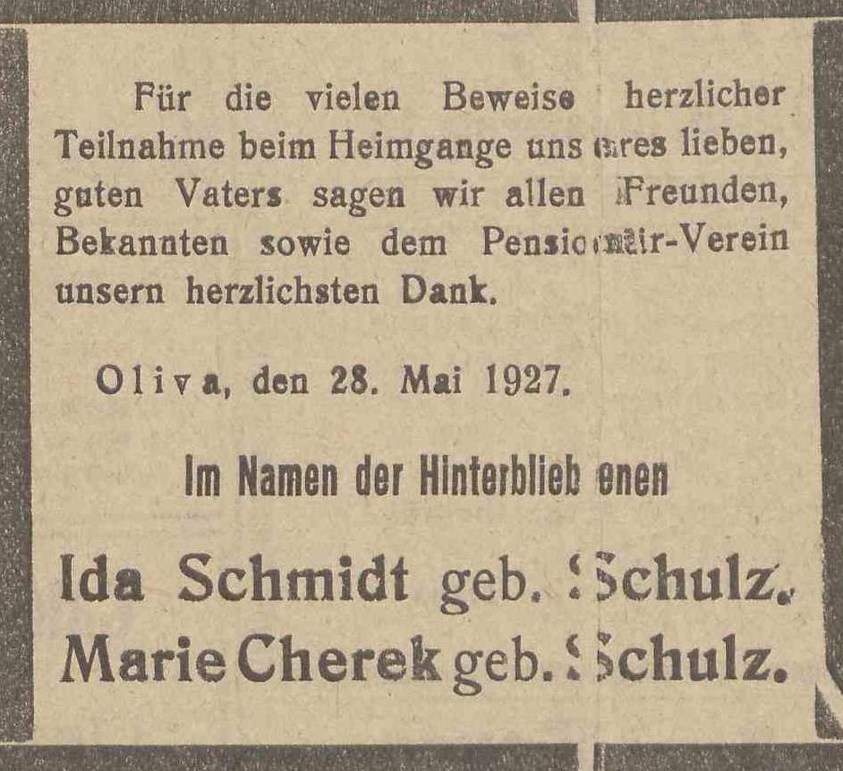 Ida Schmidt zd. Schulz. Marie Cherek zd. Schulz. Olivaer Zeintung nr 123 z 28. 05. 1927 r.