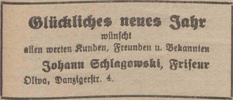Johann Schlagowski, Friseur. Podziękowania noworoczne, Olivaer Zeitung nr 306 z 31. 12. 1928.