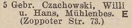 Hans, Willy Czachowski. Książka adresowa gminy Oliwa z 1914 roku. Zbiory Pomorskiej Biblioteki Cyfrowej.