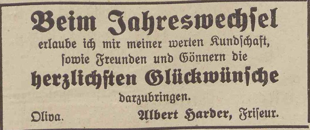 Albert Harder. Podziękowania noworoczne, Olivaer Zeitung nr 306 z 31. 12. 1920.