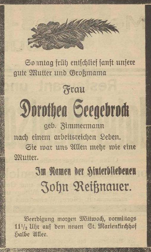 Dorothea Seegebrock zd. Zimmermann. John Reißnauer. Olivaer Zeintung nr 176 z 31. 07. 1923 r.