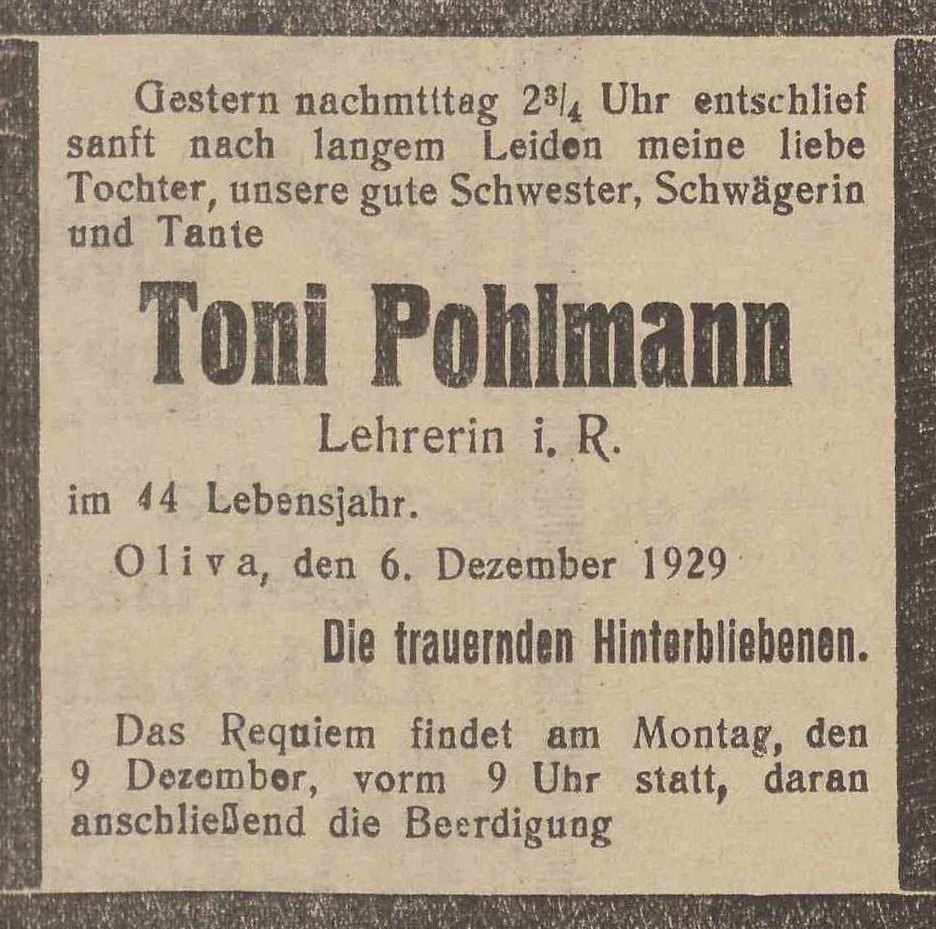 Toni Pohlmamm. Olivaer Zeintung nr 287 z 12. 07. 1929 r.