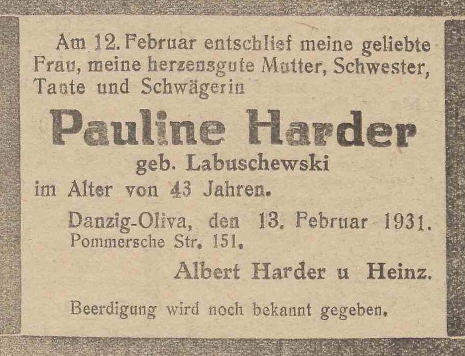 Pauliner Harder zd. Labuschewski. Albert Harder. Olivaer Zeintung nr 37 z 13. 02. 1931 r.