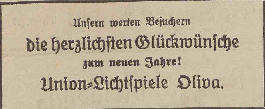 Union Lichtspiele. Podziękowania noworoczne, Olivaer Zeitung nr 305 z 31. 12. 1924.
