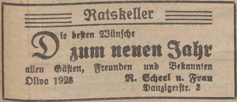 Reinhold Scheel, Ratskeller. Podziękowania noworoczne, Olivaer Zeitung nr 306 z 31. 12. 1928.