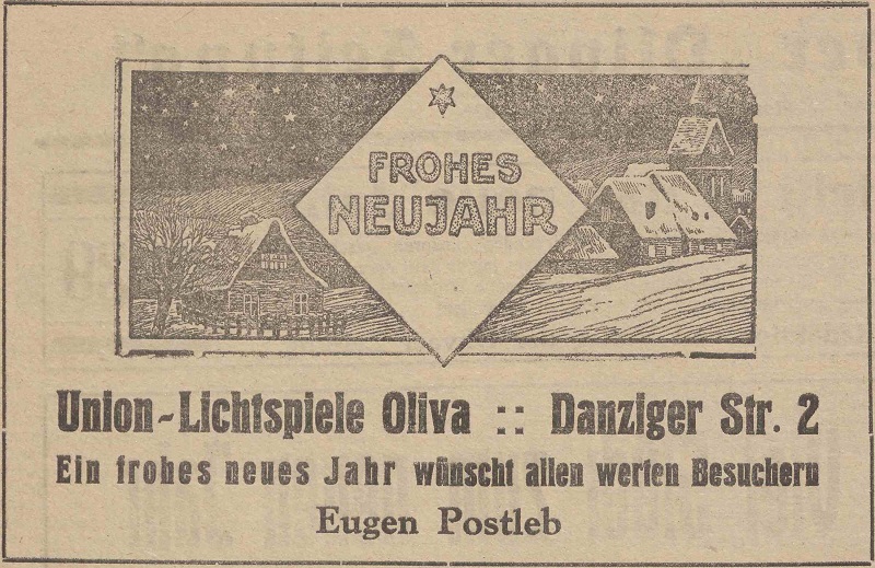 Eugen Postleb, Union-Lichtspiele. Podziękowania noworoczne, Olivaer Zeitung nr 306 z 31. 12. 1928.