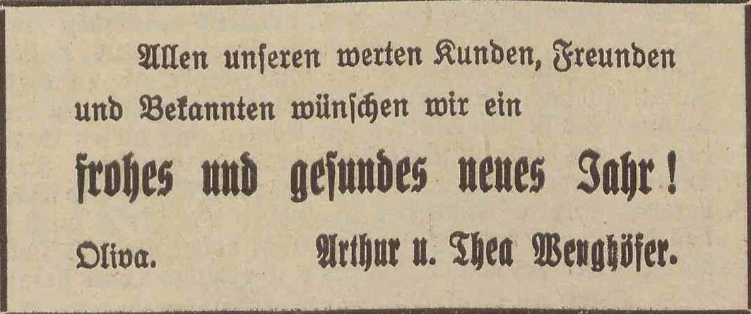 Arthur u. Thea Wenghöfer. Podziękowania noworoczne, Olivaer Zeitung nr 305 z 31. 12. 1924.