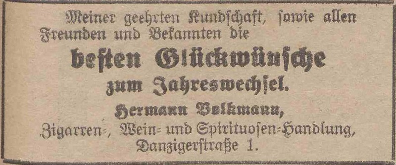 Hermann Volkmann, Spirituosen-Handlung. Podziękowania noworoczne, Olivaer Zeitung nr 306 z 31. 12. 1928.