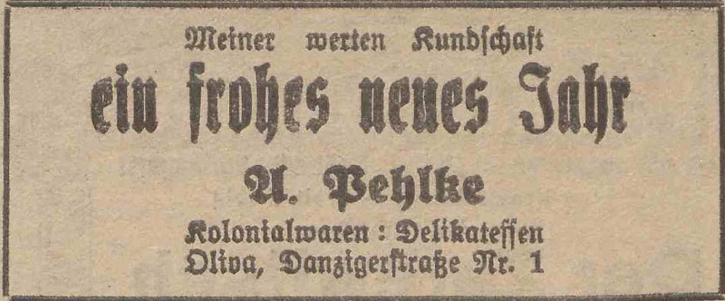 A. Pehlke, Kolonialwaren, Delikatessen. Podziękowania noworoczne, Olivaer Zeitung nr 306 z 31. 12. 1928.