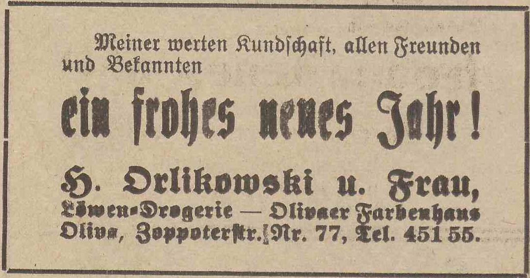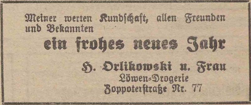 Hans Orlikowski, Löwen-Drogerie. Podziękowania noworoczne, Olivaer Zeitung nr 306 z 31. 12. 1928.
