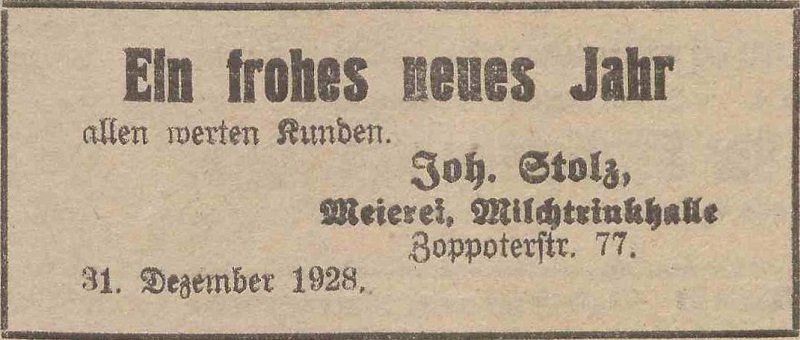 Joh. Stolz, Meierei, Milchtrinkhalle. Podziękowania noworoczne, Olivaer Zeitung nr 306 z 31. 12. 1928.