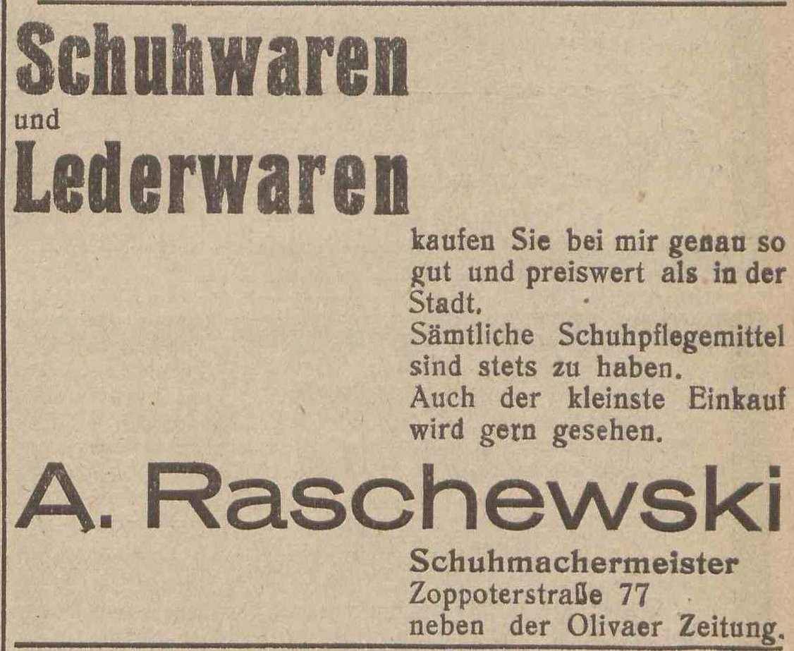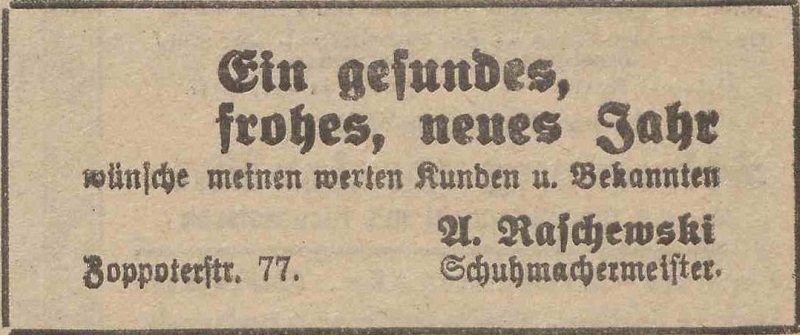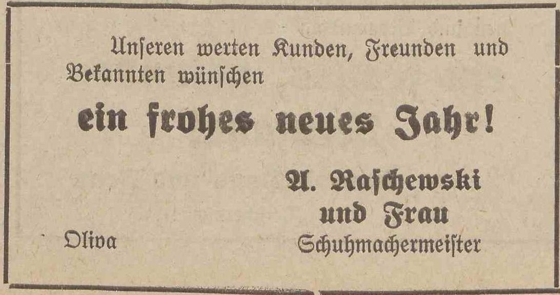 Albert Raschewski, Schuhmachermeister. Podziękowania noworoczne, Olivaer Zeitung nr 306 z 31. 12. 1928.