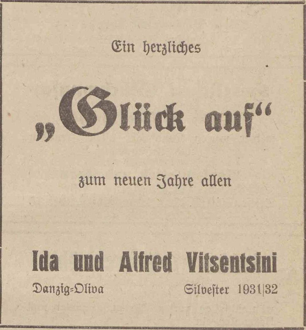 Ida Vitsentaini, Alfred Vitsentaini. Podziękowania noworoczne, Olivaer Zeitung nr 305 z 31. 12. 1931.