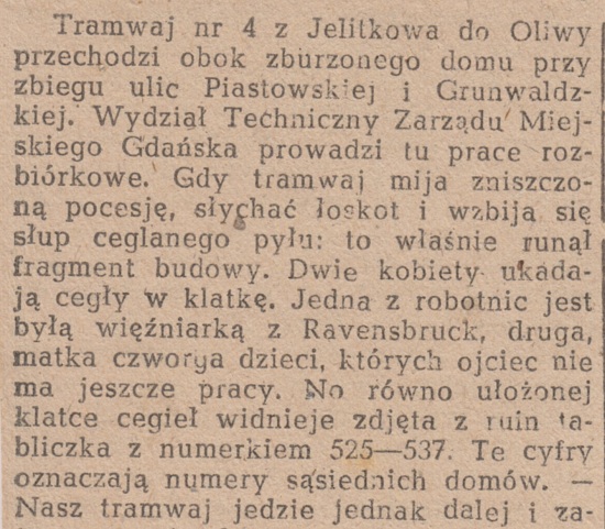 Jerzy Sawiczki, Oliwa lata czterdzieste, Rekopis, Gdańsk 2009 r.: "Spalone takrze były obydwa narożniki Piastowskiej i Grunwa-ldzkiej" [przełom lat 1945-1946].