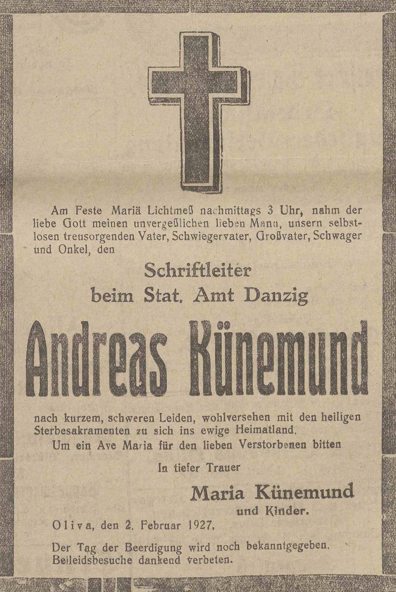 Anders Künemund, Schriftleiten Amt Danzig. Maria Künemund. Olivaer Zeintung nr 28 z 03. 02. 1927 roku.