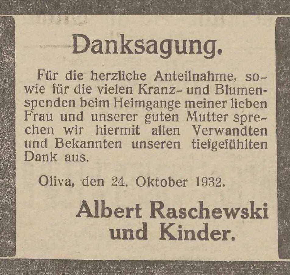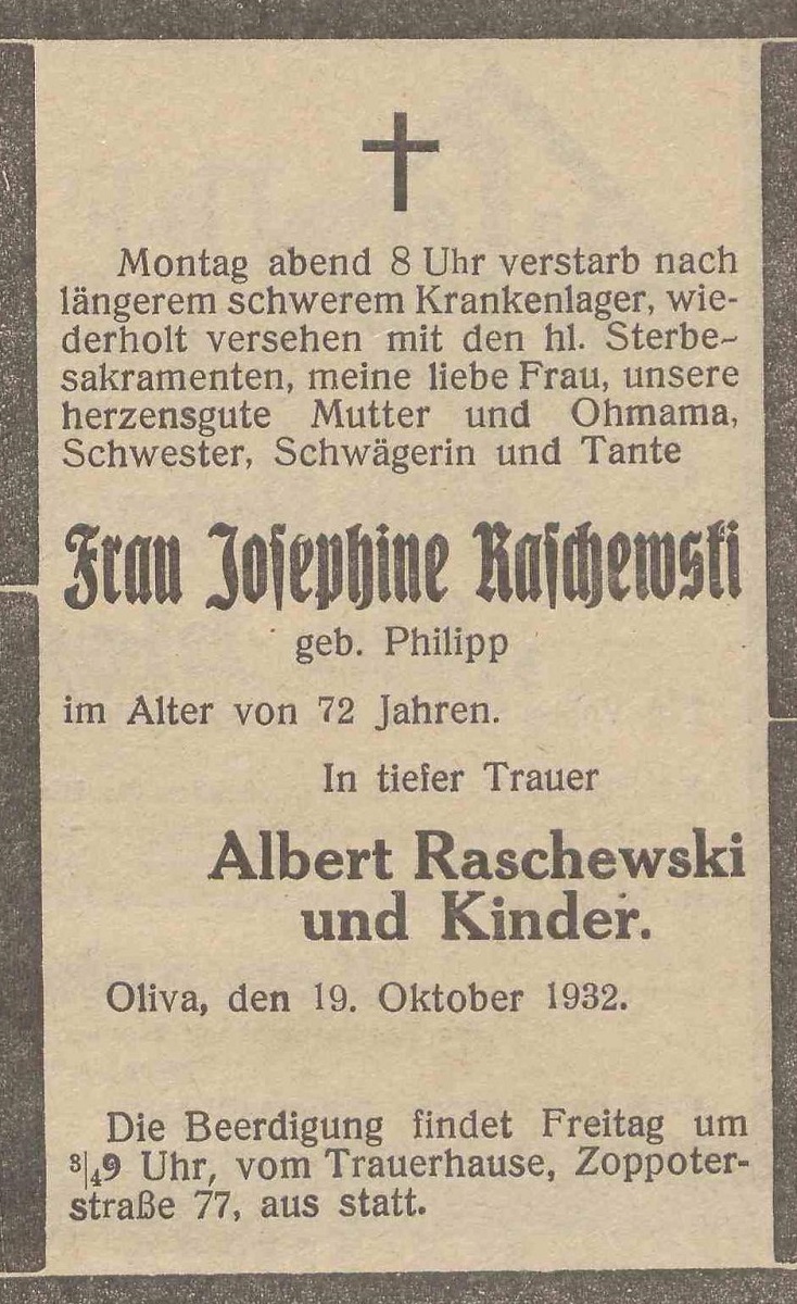 Josephine Raschewski zd. Philipp. Albert Raschewski. Danzig-Olivaer Zeintung nr 246 z 19. 10. 1932 r.