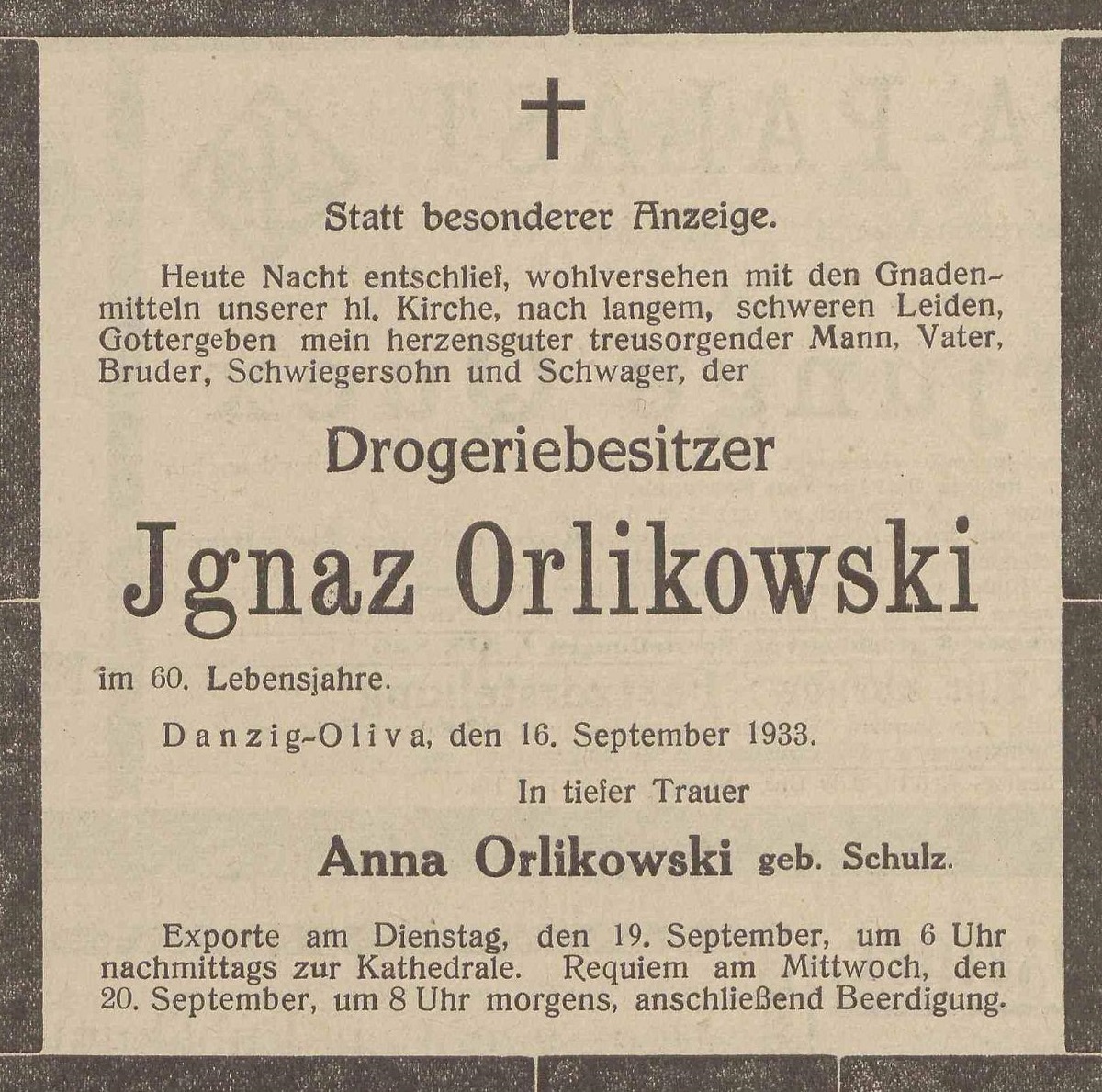 Ignaz Orlikowski. Anna Orlikowski zd. Schulz. Danzig-Olivaer Zeintung nr 218 z 16. 09. 1933 r.