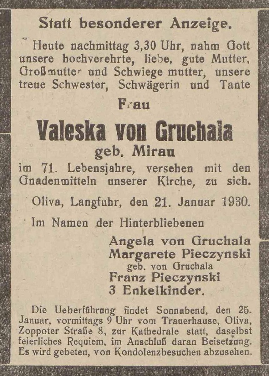Valeska Gruchala zd. Mirau. Angela Gruchala. FGranz, Margarete Pieczynski zd. Gruchala. Olivaer Zeintung nr 18 z 22. 01. 1930 r.