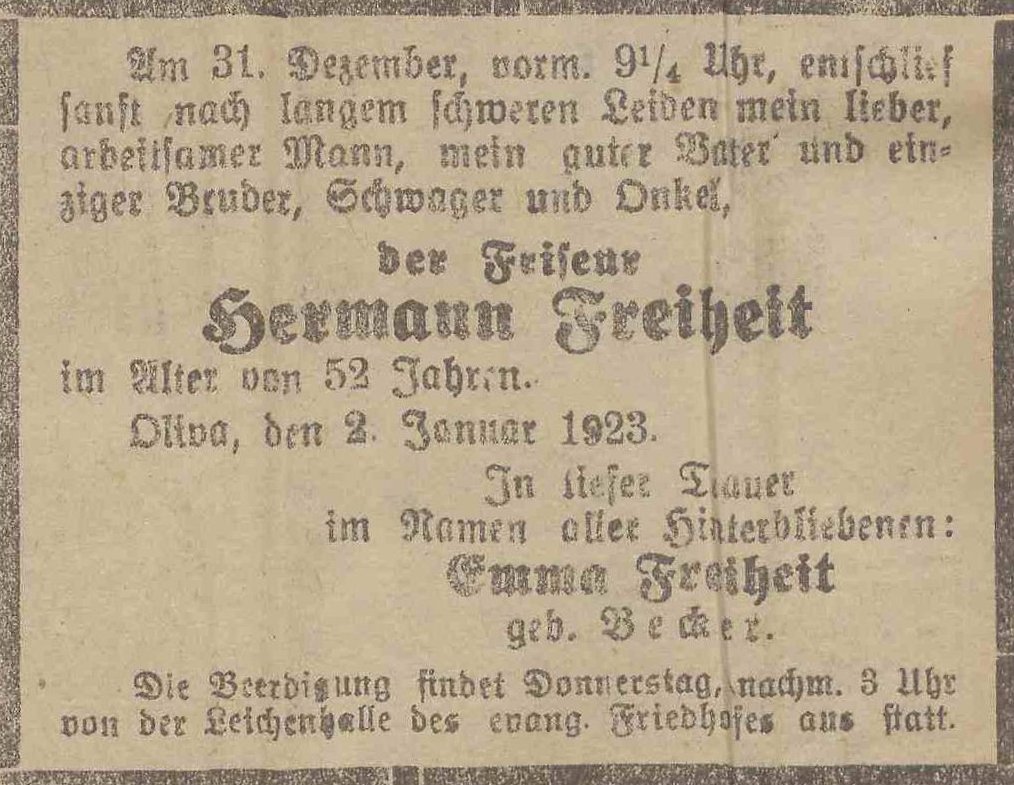 Hermann Freiheit. Emma Freiheit zd. Becker. Olivaer Zeintung nr 1 z 02. 01. 1920 r.