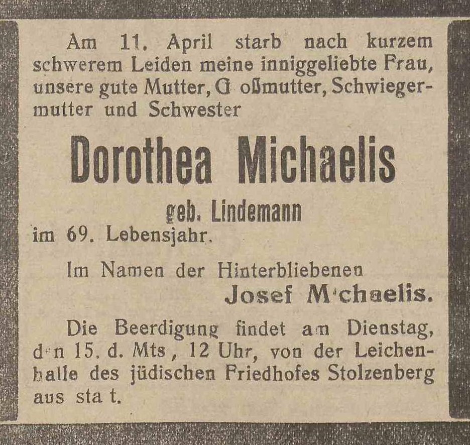 Dorothea Michaelis zd. Lindemann. Josef Michaelis. Olivaer Zeintung nr 87 z 12. 04. 1930 r.