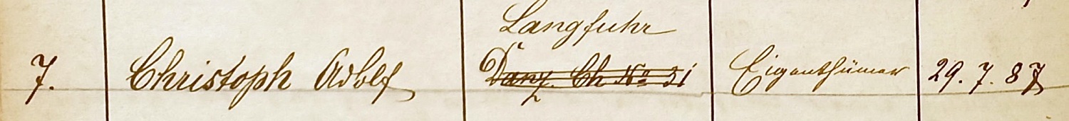 Christoph. Zoppoter Chaussee 31. Baukonholle Oliva IXX. Wpis z 29. 07. 1887. Przekazała Grażyna Niemyjska.
