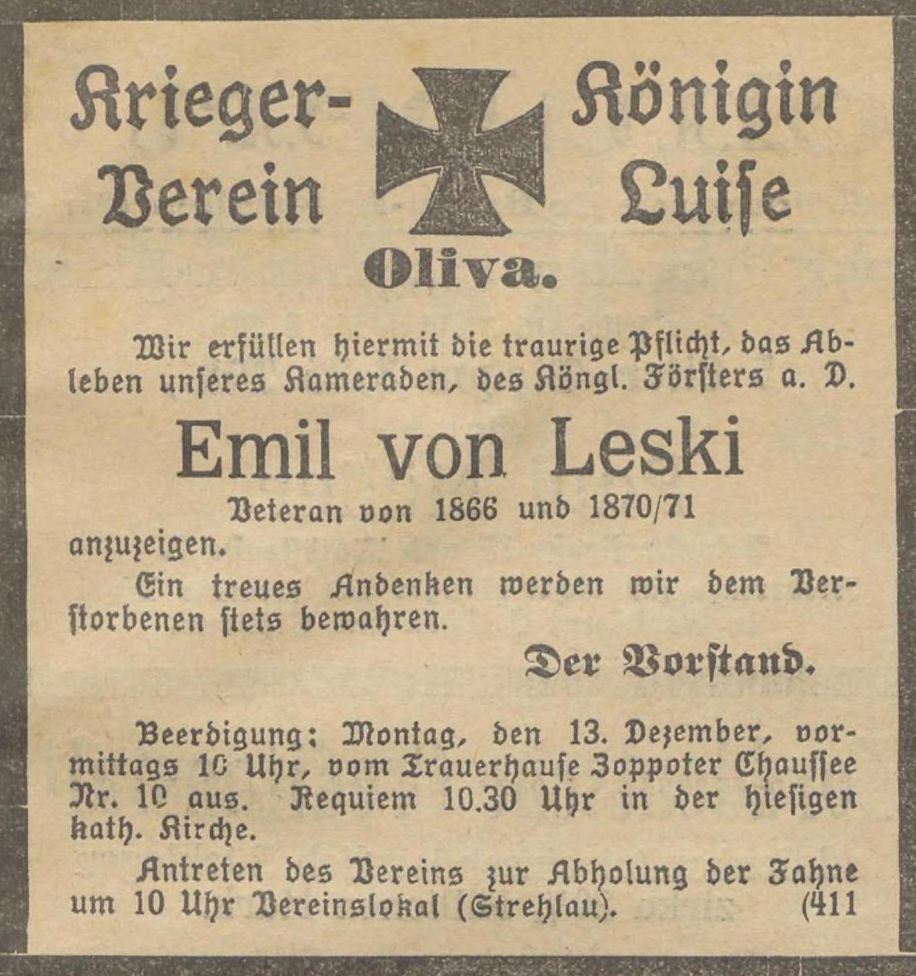 Emil Leski. Olivaer Nachrichten nr 99 z 12. 12. 1909 r.