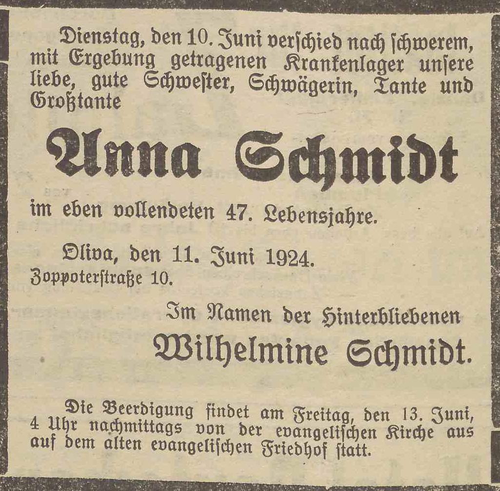 Anna Schmidt. Wilhelmine Schmidt. Olivaer Zeintung nr 134 z 11. 06. 1924.