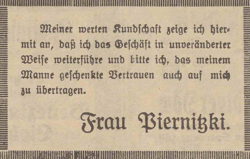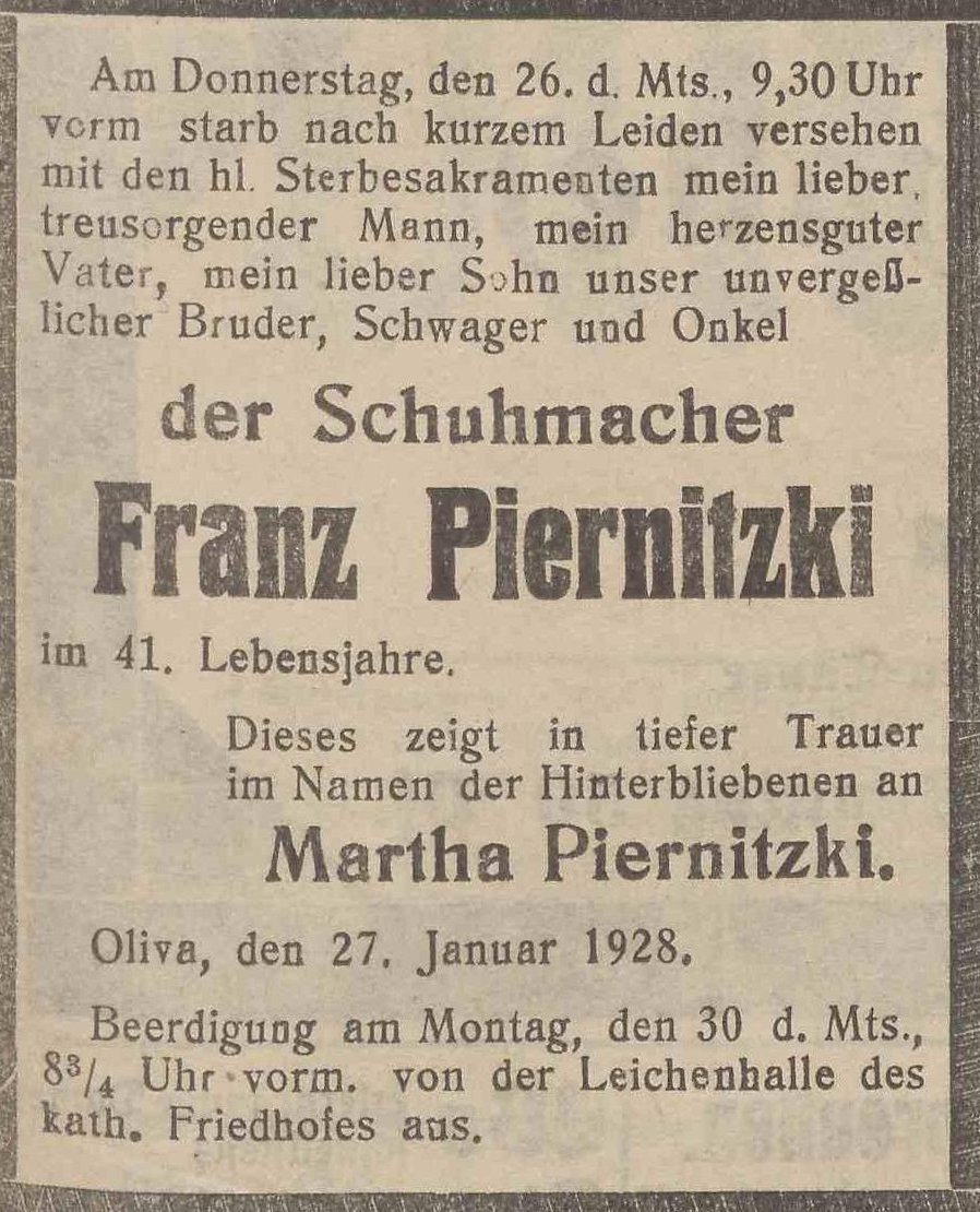 Franz Piernitzki. Martha Piernitzki. Olivaer Zeintung nr 23 z 27. 01. 1928 r.