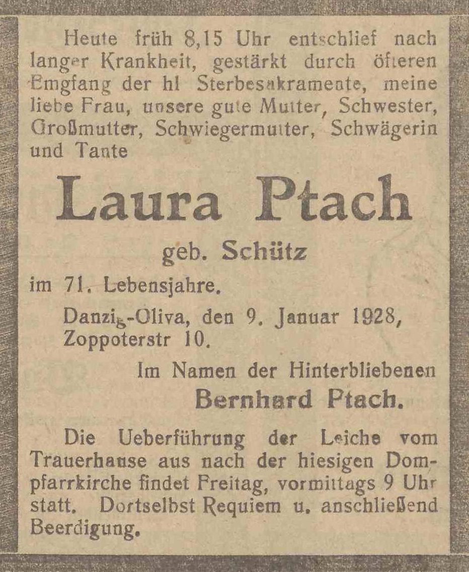 Laura Ptach z domu Schülz. Bernhard Ptah. Olivaer Zeintung nr 8 z 10. 01. 1928 r.