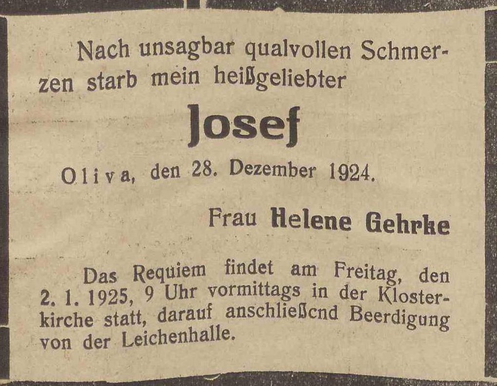 Josef Gehrke. Helene Gehrke. Olivaer Zeintung nr 304 z 30. 12. 1924 r.