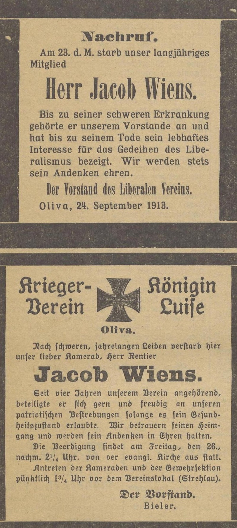 Jacob Wiens. Olivaer Nachrichten nr 113 z 25. 09. 1913 r. / www.Polona.pl.